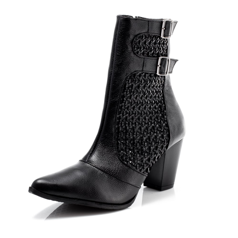 “Elegância com personalidade. Essa bota em couro preto traz um design sofisticado com detalhes na lateral que fazem toda a diferença. O bico fino alonga a silhueta e adiciona um toque refinado, enquanto o salto bloco garante conforto e estabilidade para usar o dia todo. Versátil e cheia de estilo, ela vai do office look ao visual da noite com facilidade.”
