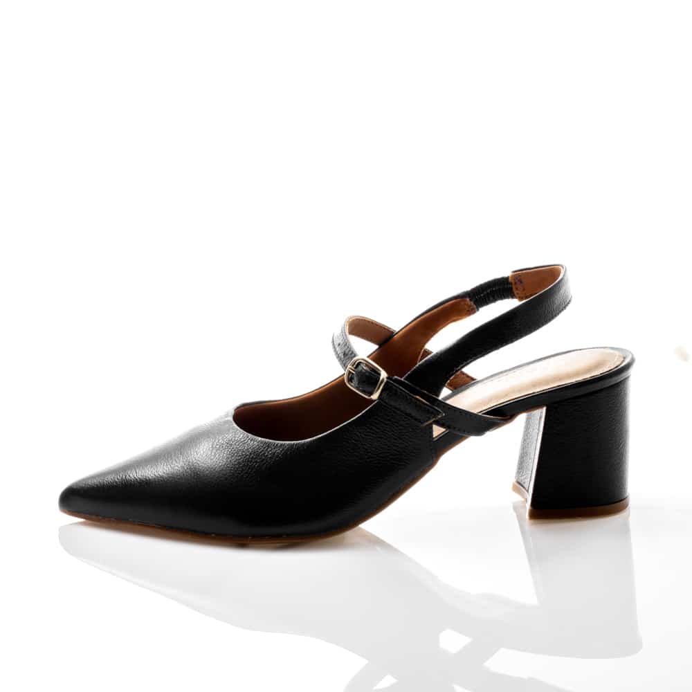 Scarpin em couro azul-marinho, com tira no peito do pé e salto bloco, que combina elegância e praticidade. A tira garante melhor ajuste e segurança ao caminhar, enquanto o salto bloco proporciona conforto e estabilidade. O acabamento em couro confere sofisticação e durabilidade, e a cor azul-marinho traz um toque clássico e versátil, ideal para looks formais ou produções mais modernas.