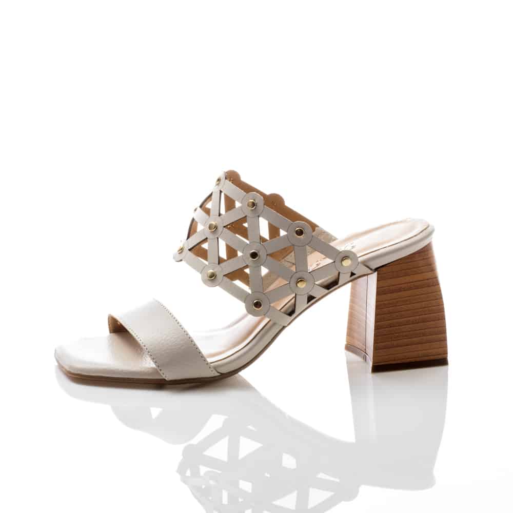 “Tamanco em couro off-white com salto bloco, elegante e versátil. O design minimalista combina sofisticação com conforto, enquanto o salto bloco garante estabilidade para o uso prolongado. Perfeito para looks casuais ou mais sofisticados, adicionando um toque moderno e discreto a qualquer produção.”